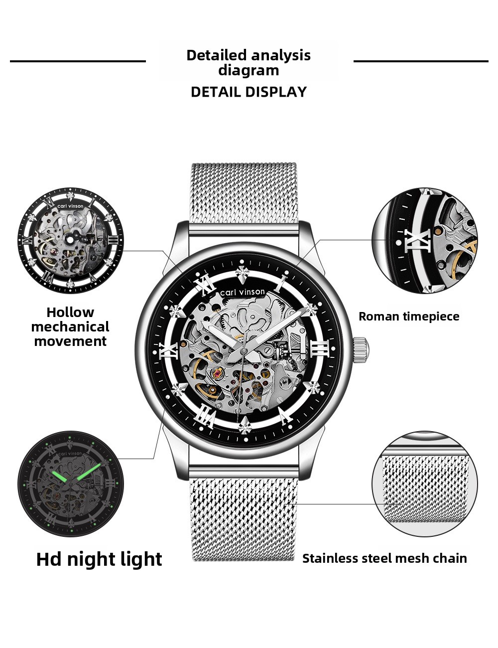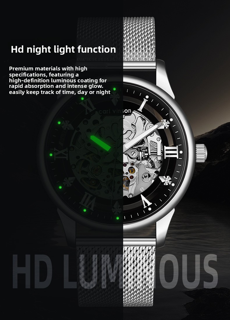 Luminous Feature: Enhanced visibility in low-light conditions with luminous hands and markers.