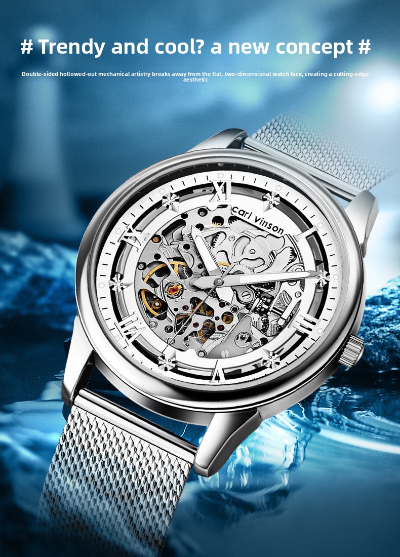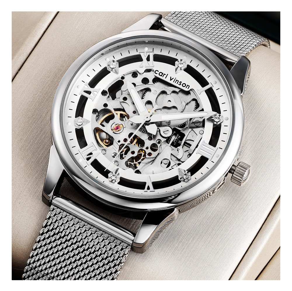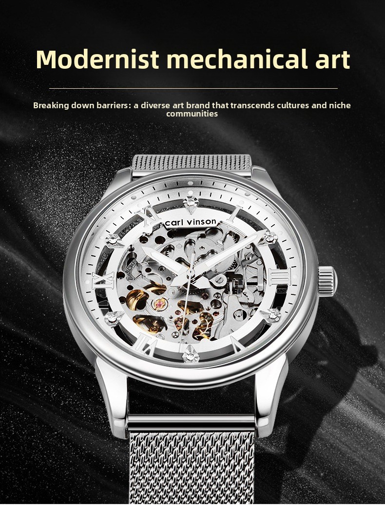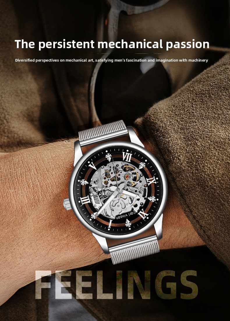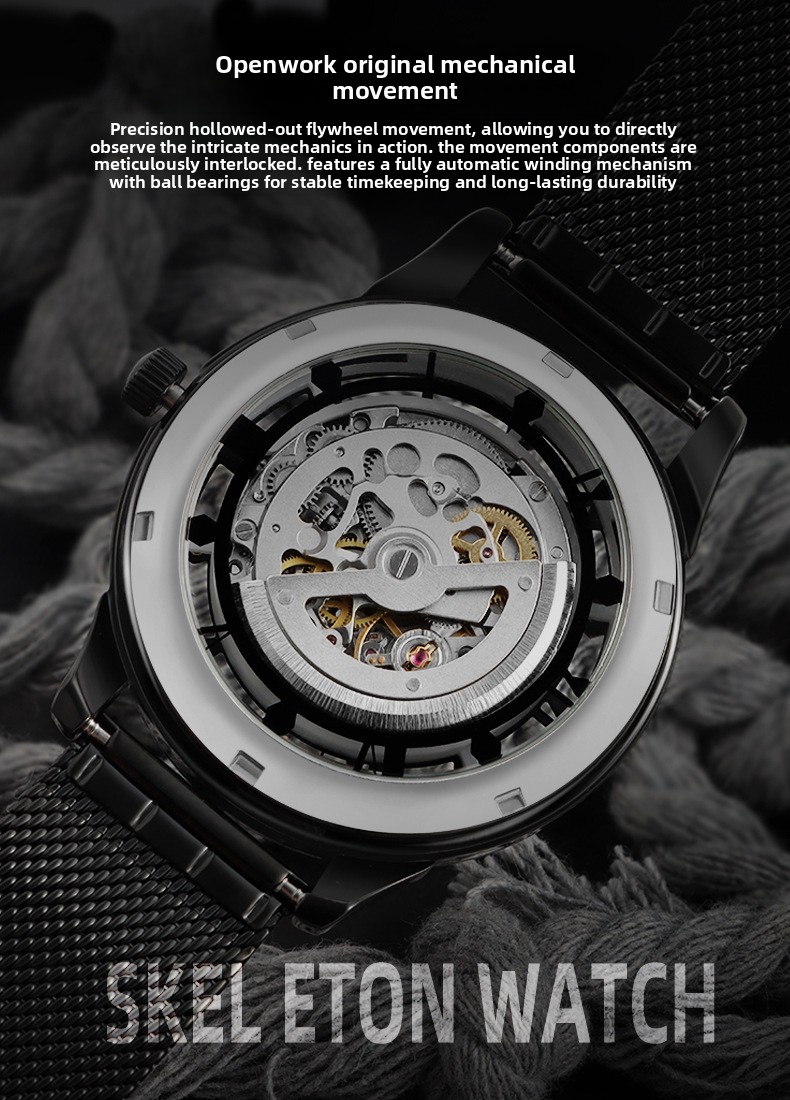 Skeleton Design: Transparent case back and dial showcasing intricate mechanical components.